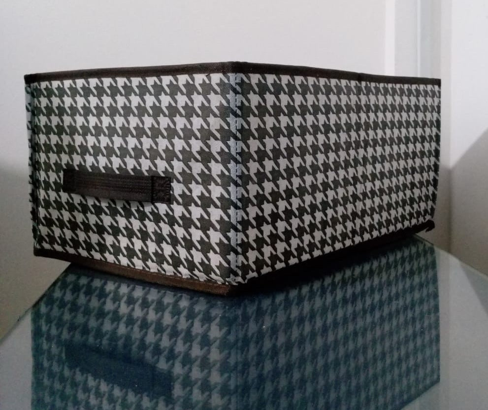 Esta es una caja organizadora de tela plegable con estampado de pata de gallo. Estas cajas se pueden usar para organizar una variedad de artículos, incluyendo ropa y accesorios, y son adecuadas para su uso en dormitorios, armarios o salas de estar.